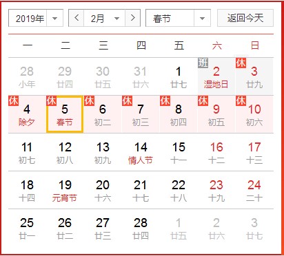 2019年2月3日至2月10日,2月11日(農歷正月初七)上班,共8天。2019年2月2日調休上班。