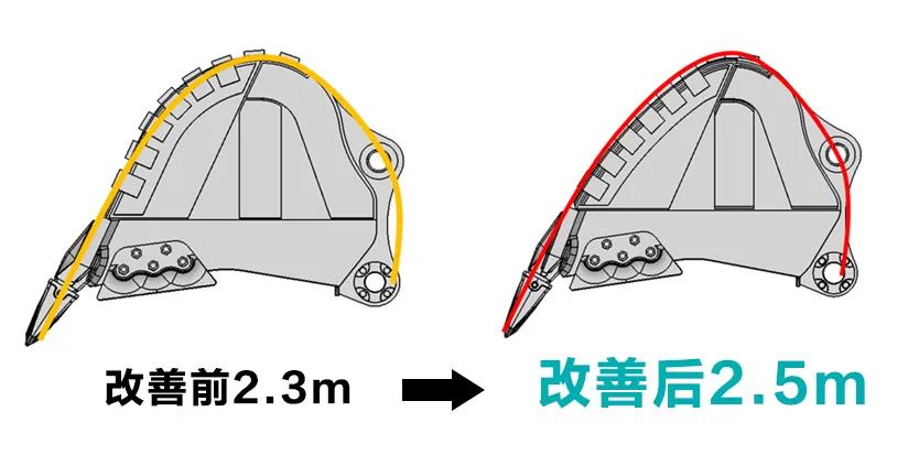 優化斗形,減少與地面的阻力,挖掘時切入更輕松自如。增大斗容,提高生產性,裝車速度更快。