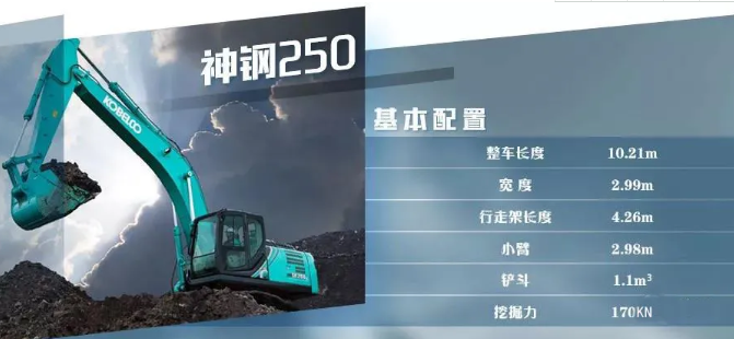 神鋼SK250整車長度10.21m,寬度2.99m,行走架長度4.26m。標配了2.98m的小臂和1.1m3的鏟斗,在力量上其鏟斗挖掘力達到170kn。